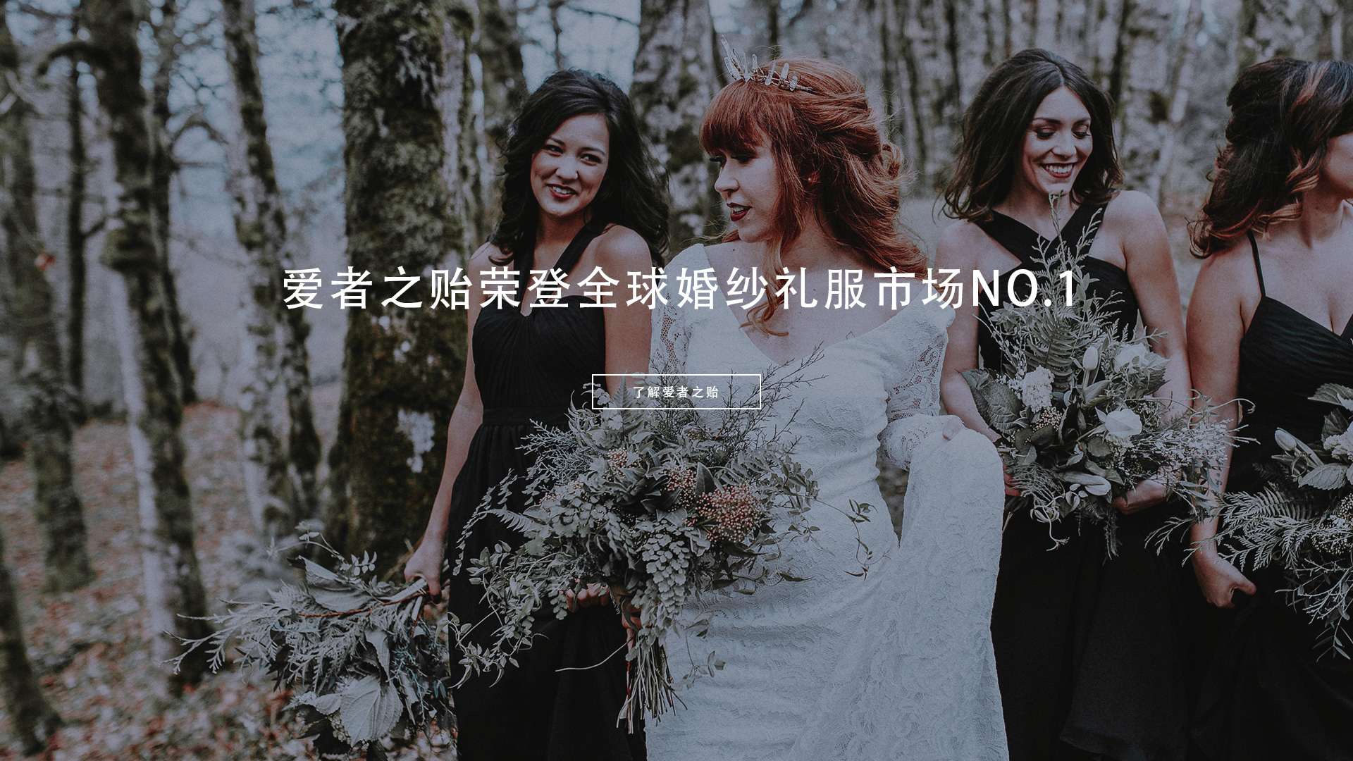 爱者之贻时尚以创一流的婚纱礼服品牌为目标,以给消费者提供最完美的婚纱礼服体验为经营宗旨,让更多人了解和关注到我们,也让更多有志之士加入到这个大家庭中。在过去的10年中,爱者之贻完成了诸多大目标:2016年市场交易单量破千万,荣登北美婚纱礼服市场No.1,成功超越亚马逊和David's bridal;2018年黑色星期五当天,交易额突破千万美元,刷新了北美婚纱礼服市场的交易记录;屡次获得北美最受欢迎婚纱礼服网站奖项,被北美各大主流媒体网站争相报道。